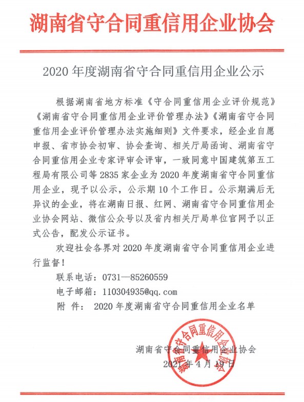 经湖南省守合同重信用企业协会评审,米兰体育网页版设计研究院有限公司荣获2020年度湖南省“守合同重信用企业”称号,这是设计院连续第三年获得此项荣誉。