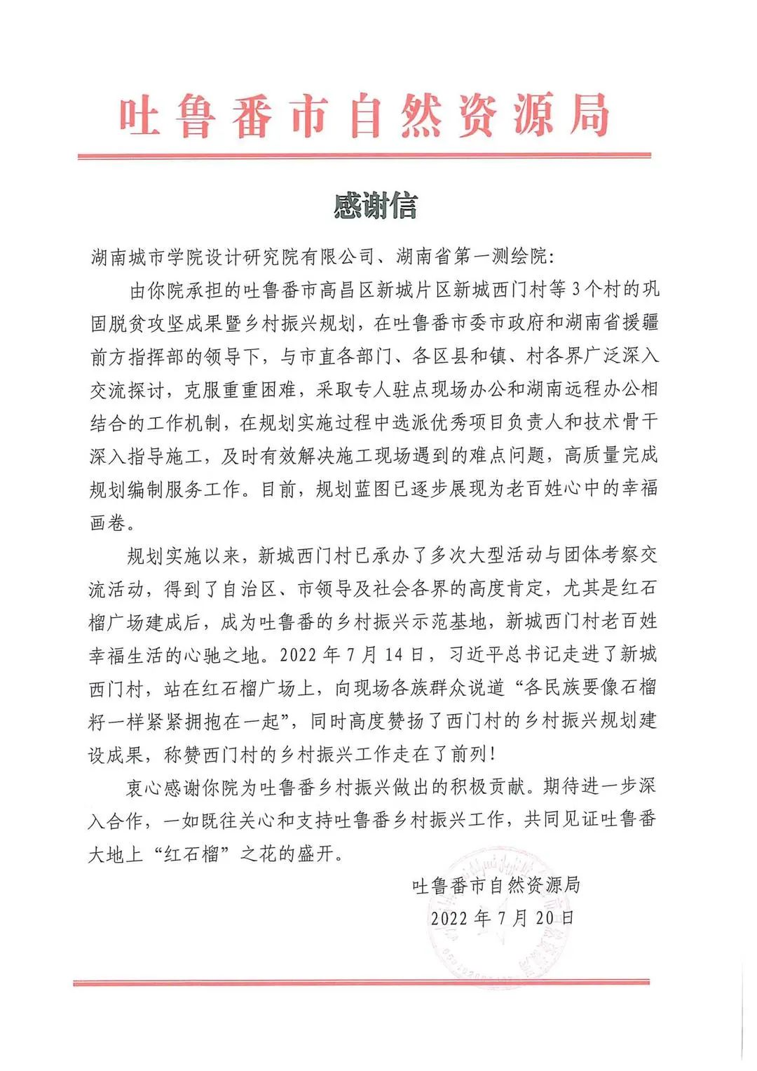 吐鲁番市自然资源局致我公司的感谢信