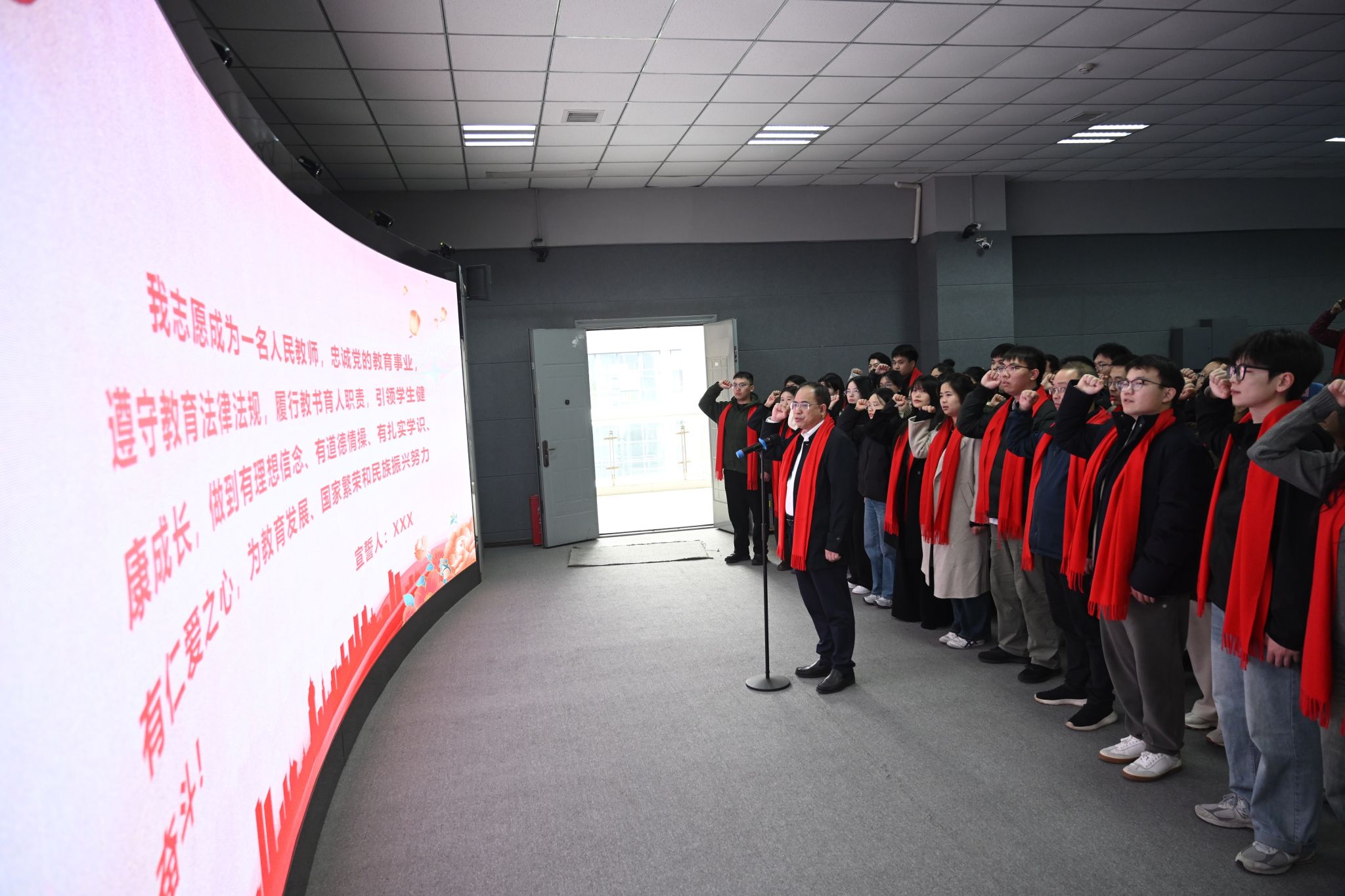 校党委书记何振带领全体新进教师庄严宣读教师誓词,铿锵誓言彰显了为党育人、为国育才的初心与决心。全体校领导为新进教师代表佩戴校徽,标志着他们正式成为米兰体育网页版大家庭的一员。