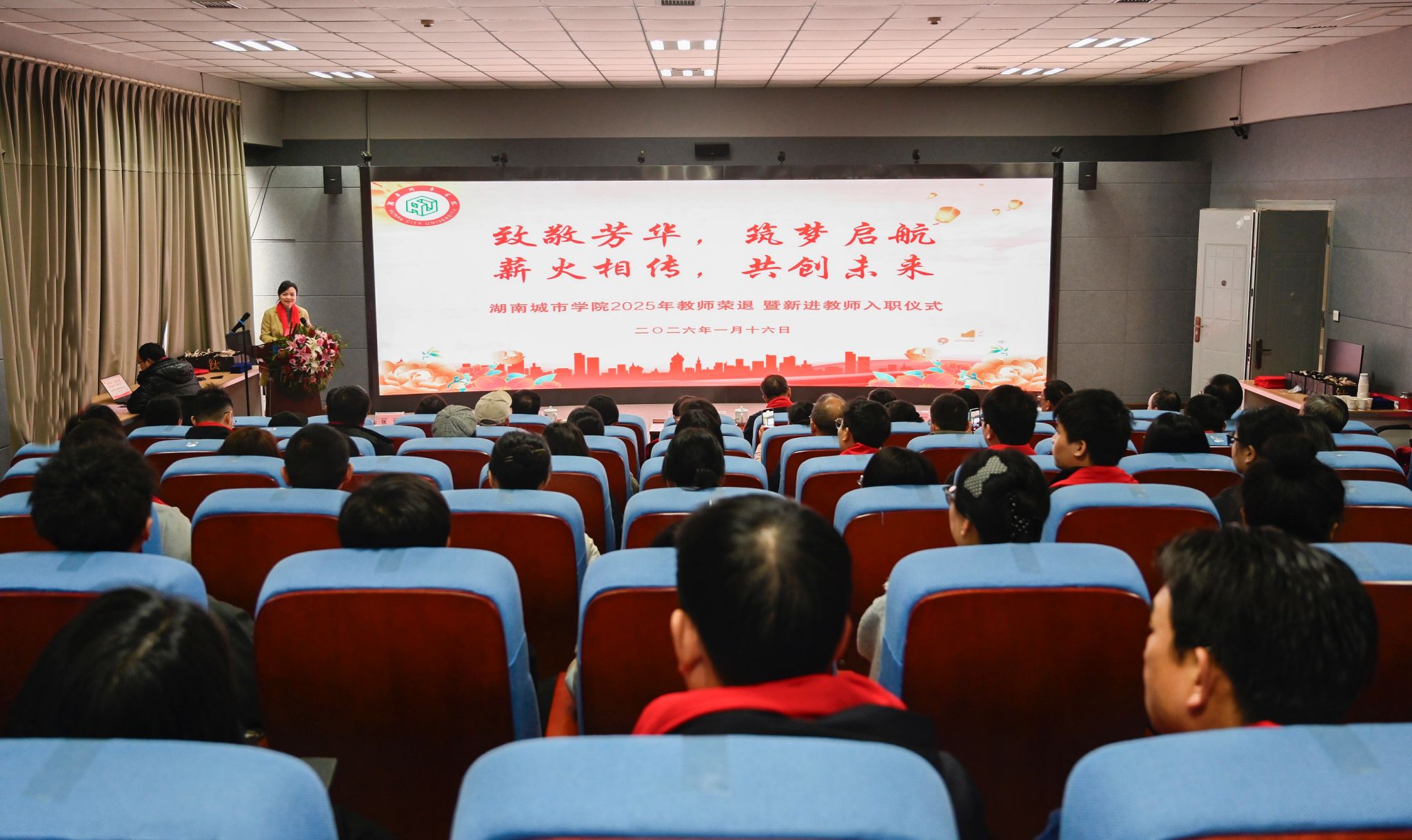 本网讯(通讯员 王丽妮)1月16日下午,学校2025年教师荣退暨新进教师入职仪式在建规楼432报告厅举行。全体校领导,各二级学院党委书记、相关部门负责人以及2025年荣退教师及新进教师代表齐聚一堂,共同见证了这一温馨时刻。仪式由校长陈瑜主持。
