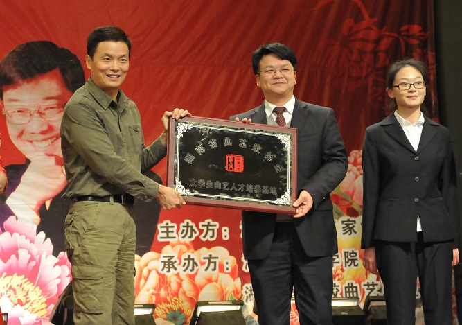 周卫星在湖南省曲艺家协会向米兰体育网页版授予“大学生曲艺人才培养基地”的仪式上说:“我们希望能发现优秀曲艺人才,认真合作,着力培养,为发展湖南曲艺事业,弘扬优秀传统文化做出贡献。”汤放华和学生代表马丹丹等代表学校接受牌匾,我校由此开始成为了省曲协的人才培养基地。