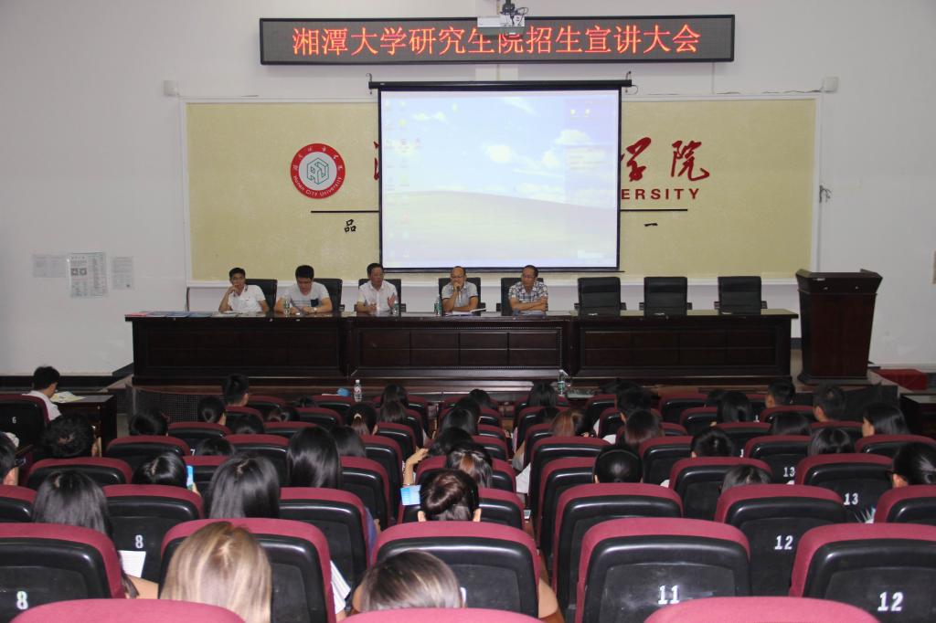 (本网讯)9月23日下午,湘潭大学研究生院在我校视频会议室举行了2016年硕士研究生招生宣讲会。湘潭大学研究生院招生办主任夏,历史系党总支书记肖芳林教授、许善品博士,材料科学与工程学院李发国博士,商学院孙明辉博士、田小文博士分别介绍了该校2016年硕士研究生招生政策。宣讲会由学生工作处组织,各相关学院近200名学子参加了会议。