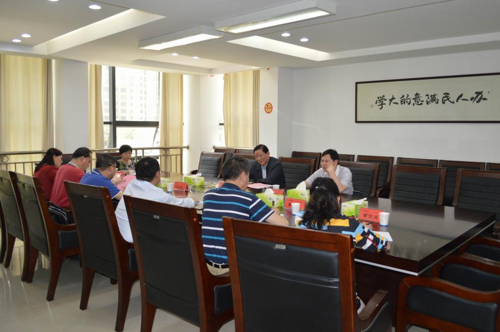 罗成翼代表学校对高新明一行来校表示热烈欢迎,对省教育工会长期以来给予我校工会工作的大力支持表示衷心感谢,并简要介绍了学校基本情况,以及第三次党代会以来实施的“一二三五”发展战略、学科整合、绩效工资改革、预算改革等情况。