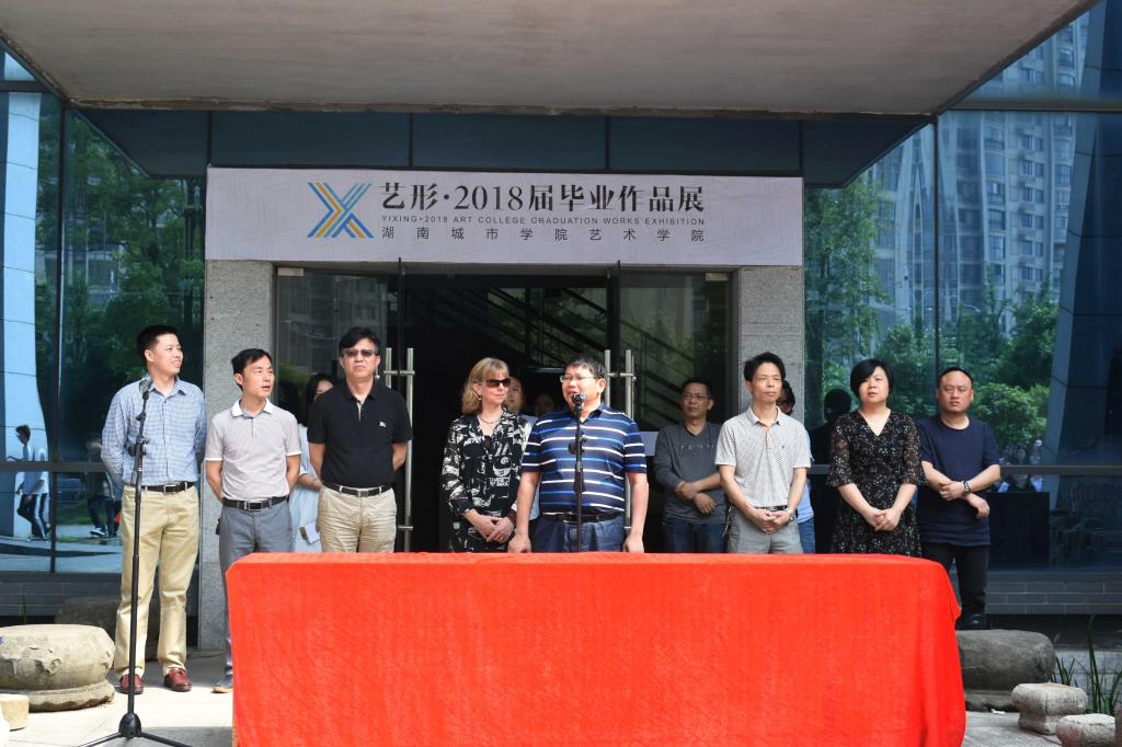 (本网讯)5月24日上午9:30,艺形·艺术学院2018届毕业作品展开幕式在美艺楼前坪隆重举行。校党委书记罗成翼,新西兰维特利亚理工学院设计系主任Brenda Saris,益阳市装饰协会秘书长何柱国,学生工作部、团委书记、艺术学院相关负责人和2014级美术学科全体毕业生出席开幕式。