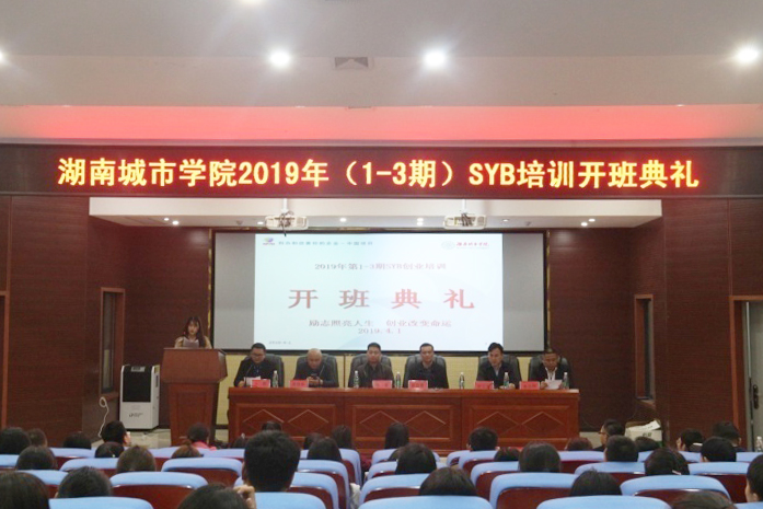 (本网讯)2019年4月1日晚,我校在建筑规划楼学术报告厅举行2019年SYB创业培训(1-3期)开班典礼。副校长雷存喜,益阳市就业服务管理局副局长陈希出席开班典礼,益阳市近20名SYB培训讲师前来观摩学习,来自全校各二级学院满怀创业激情的90名学员参加了开班典礼。开班典礼由继续教育学院院长贺正宜主持。