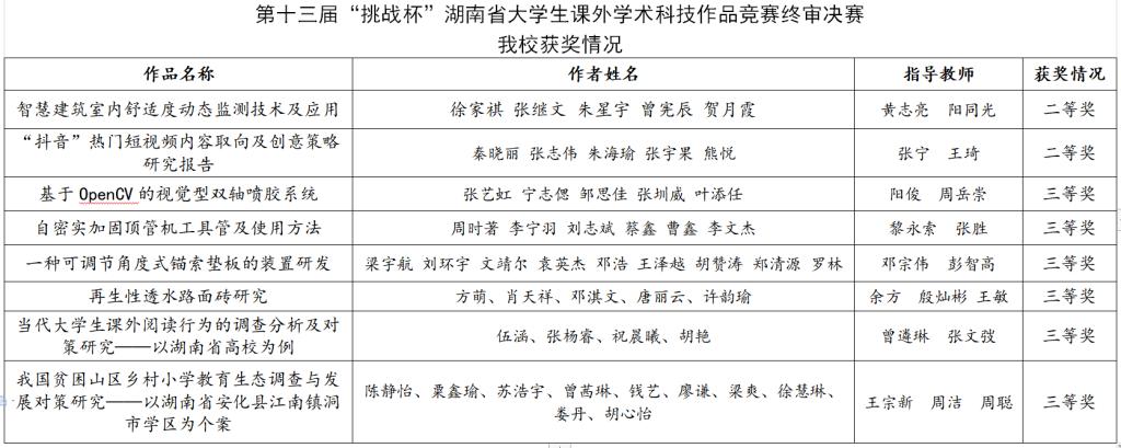 本网讯2019年5月31日至6月2日,由共青团湖南省委、湖南省教育厅、湖南省科技学术协会、湖南省社会科学院、湖南省学生联合会联合举办的第十三届“挑战杯”湖南省大学生课外学术科技作品竞赛终审决赛在中南林业科技大学举行。我校8件作品进入终审决赛,经过与全省36所高校277件作品的激烈竞争,获得了二等奖2项三等奖6项的优异成绩,其中《智慧建筑室内舒适度动态监测技术及应用》及《“抖音”热门短视频内容取向及创意策略研究报告》获得“挑战杯”国赛资格。
