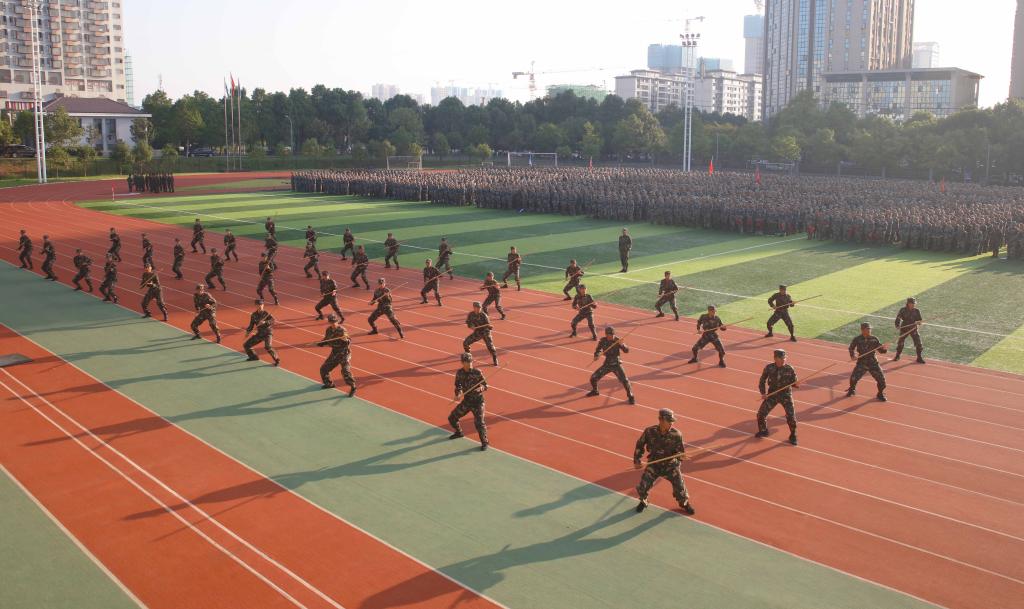 检阅开始,教官和来自各连的优秀学员进行了应急棍、格斗基本功、战术表演、擒敌拳等11个项目的表演,擒敌拳和匕首操英姿飒爽;刺杀操和军体拳刚劲有力;战术表演引人注目,充分展示了我校2021级学子斗骄阳、战酷暑的军训成果和坚毅进取、团结友爱的精神。随后,分列式表演正式开始,教官方阵和40个新生方阵军容严整、士气高昂,他们依次经过主席台,接受学校领导和在场师生的检阅,他们的动作整齐划一、口号响彻云霄。