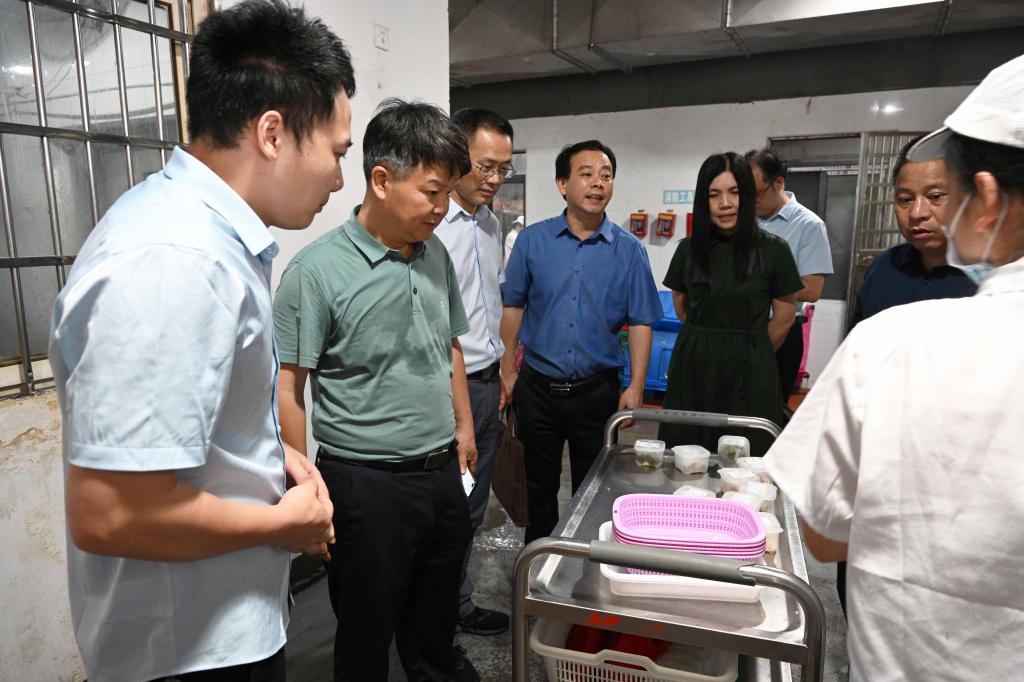 在化学危险品库,李建奇一行查看了危化品储存室、危险废物储存室的建设情况,听取了相关负责人对化学危险品库所采取的人防、技防、物防等综合保障体系的介绍,要求材化院充分吸取国内实验室发生的重大安全事故的经验教训,高度重视危险化学品安全管理工作,把安全管理各项措施落到实处。在北门综合楼,李建奇检查了部分门店安全状况,要求相关负责人按照属地管理要求,督促相关门店做好安全隐患整改。在第一食堂,汤放华详细了解食堂食品采购、贮存、加工制作、供餐等环节安全管控情况,要求食堂管理人员严格执行餐饮服务食品安全操作规范,筑牢食品安全防线,确保广大师生员工“舌尖上”的安全。