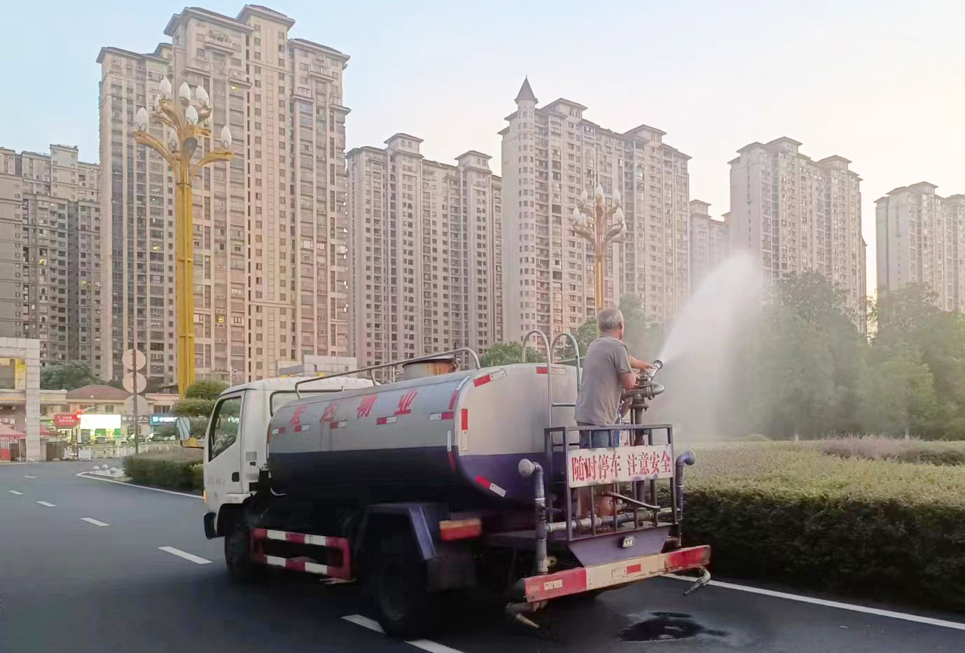 后勤人员给绿化带浇水。