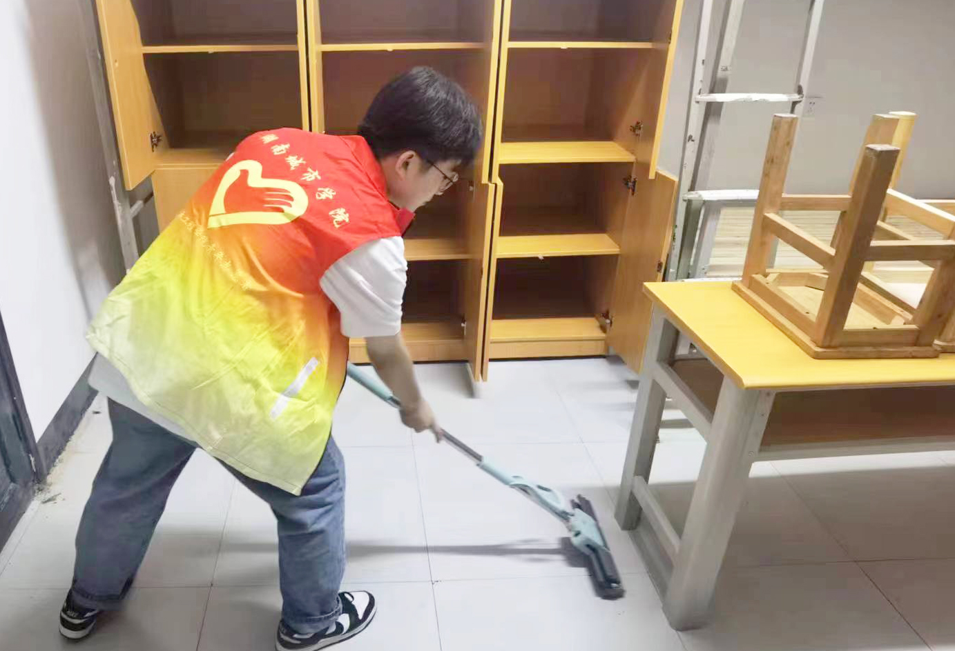 志愿者们对新生宿舍进行清扫。