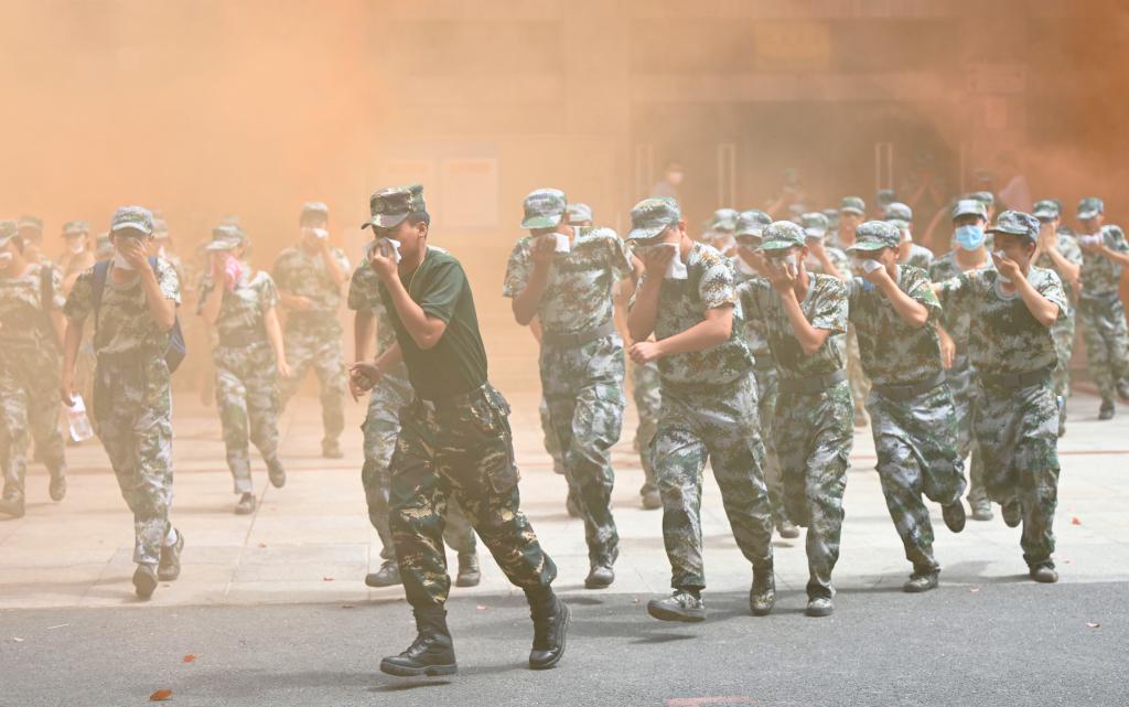 9月20日,米兰体育网页版参加消防演练的同学们用湿毛巾捂住口鼻,有序撤离。