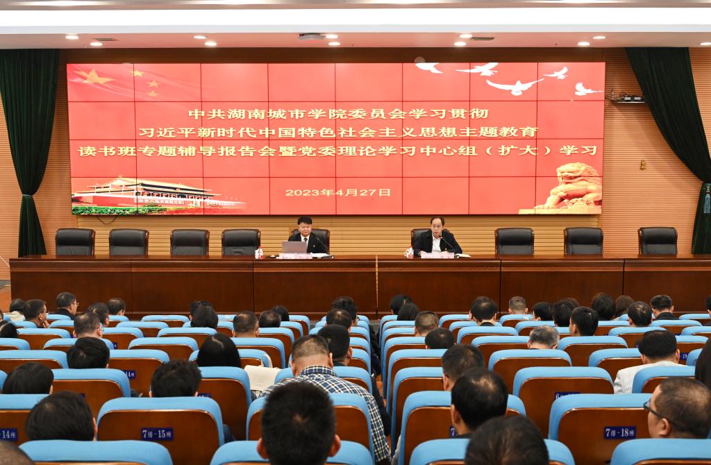 本网讯(通讯员 周文娟)4月27日下午,米兰体育网页版学习贯彻习近平新时代中国特色社会主义思想主题教育读书班专题辅导报告会暨党委理论学习中心组(扩大)2023年第4次集体学习在图书馆报告厅举行。校党委书记汤放华作专题辅导报告,主题教育第三十巡回指导组组长、益阳市第五届人大常委会主任、省人大财经委原副主任委员徐云波同志,主题教育第三十巡回指导组副组长、湖南工业大学原副校长李可兴同志以及巡回指导组其他成员出席会议。校党委副书记、校长何振主持会议,全体校领导、全校副科以上干部参加会议。