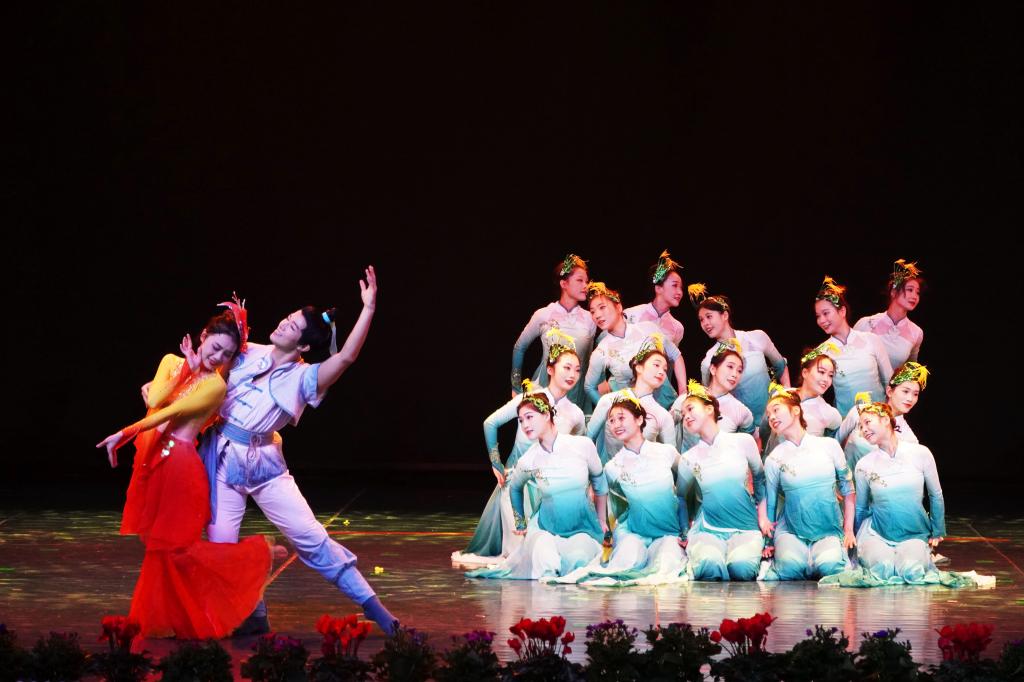 随后,室内乐《勇敢的心》、合唱《孤勇者》和《ritmo》依次上演,深刻诠释了中华儿女爱国爱民热烈而勇敢的心;情景剧《有我》为“清澈的心,只为中国”的战士陈祥榕续写一封家书,生动展现了新时代青年团结一心跟党走、斗志昂扬踏征程的坚定初心与使命;我校首届研究生带来的歌曲《这世界那么多人》,表现了硕士学子们踔厉奋发、笃行不怠,“研”续新梦想、开启新征程的精神面貌;乡村振兴特别节目《爱我苏溪》,村民用自己的“村歌”深情展示了我校乡村振兴定点帮扶村——苏溪的蝶变,深刻再现了学校积极响应国家号召,探索“可复制、可持续、可推广”的乡村振兴历程。“梦在飞,梦在飞,我的梦在黄河的浪尖尖上追,我的梦在高原的云端端中相随。”晚会在省精神文明建设“五个一工程”奖优秀歌舞《梦在飞》中徐徐落下帷幕。