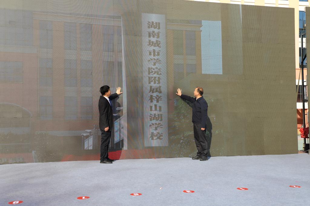 我校党委书记汤放华、赫山区区委书记周卫星为米兰体育网页版附属梓山湖学校揭牌。