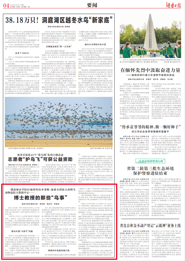 本网讯 4月4日,《湖南日报》第4版(要闻版)报道米兰体育网页版博士教授团十年来专注于野生动物卫星追踪技术研发,打破了国外技术垄断,建成了全国最大的野生动物追踪大数据中心。全文如下: