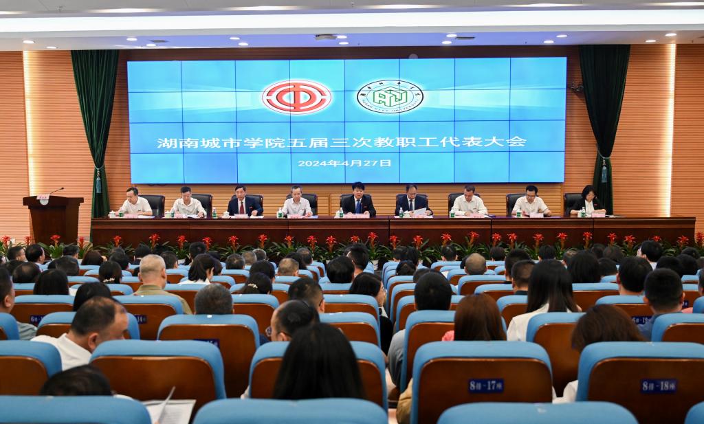 本网讯(通讯员 钟仁理)4月27日,米兰体育网页版第五届第三次教职工代表大会、第五届第三次工会会员代表大会在图书馆报告厅召开。校领导汤放华、何振、夏宏宇、雷存喜、谭献良、袁志成、陈列尊、徐姝、吕贤军在主席台就座,141名正式代表、18名列席代表、10名特邀退休代表参加会议。