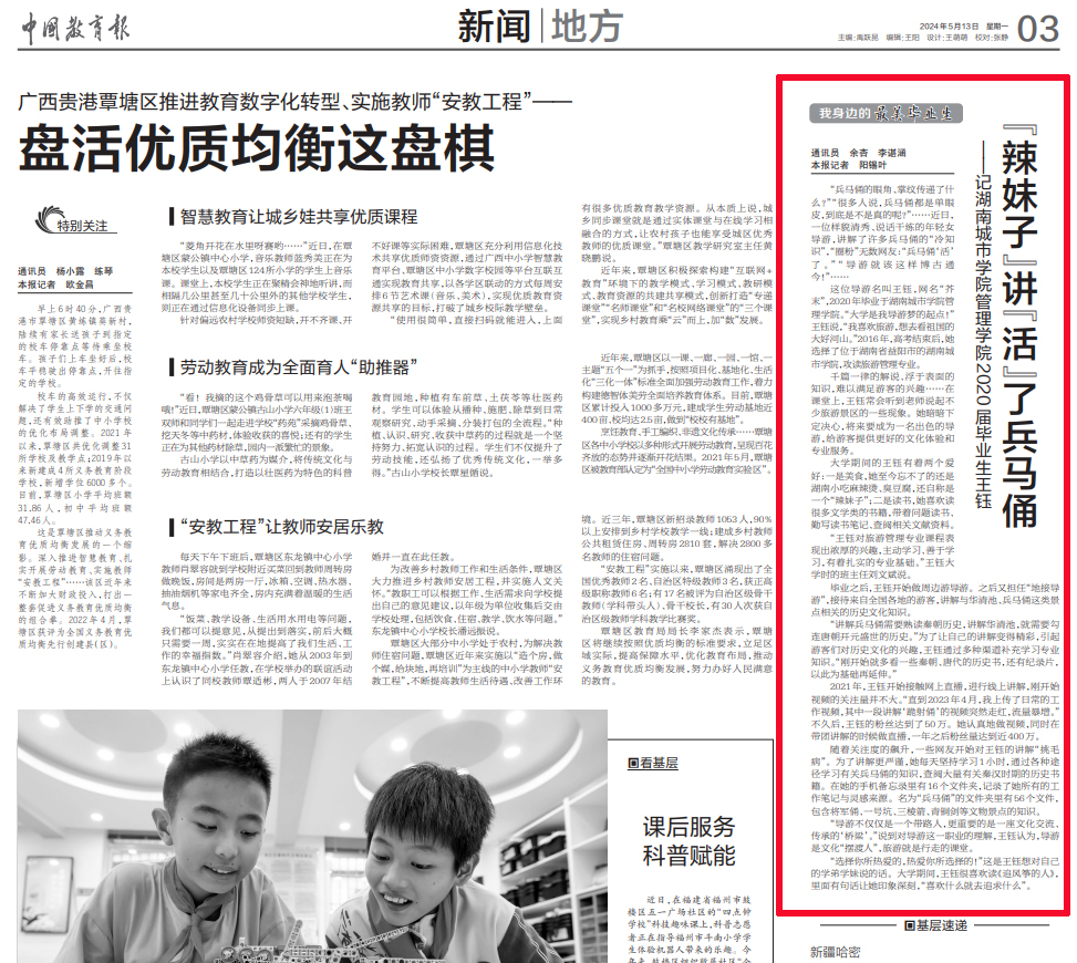 本网讯 5月13日,《中国教育报》第3版报道米兰体育网页版管理学院2020届优秀校友王钰讲“活”兵马俑、火爆全网的青春励志故事。全文如下: