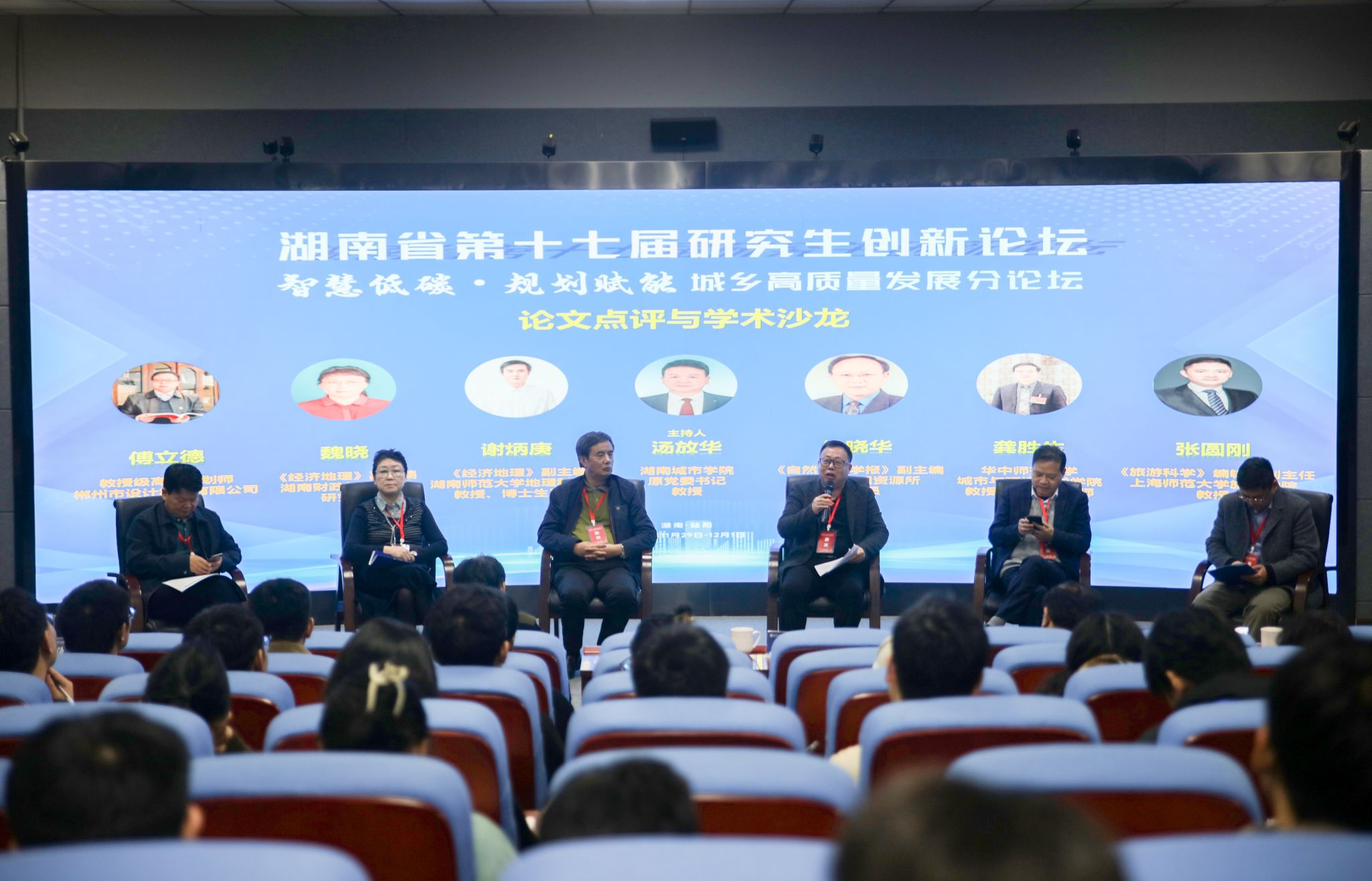 论文点评与学术沙龙环节由米兰体育网页版汤放华教授主持。学术沙龙环节邀请了6位国内知名专家学者和与会研究生共同参与,围绕“数字赋能城乡空间规划”“低碳安全与健康城市规划”“新时代乡村振兴与规划建设”“城市设计与城市更新”等议题进行了深入探讨。