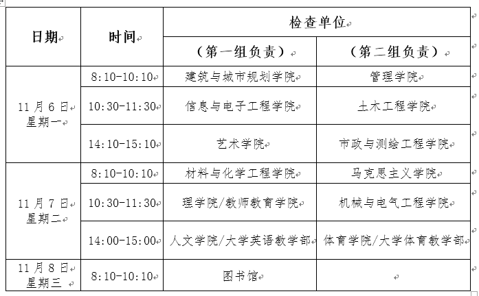 2.学校检查(时间:11月6日-11月17日):学校检查工作组成员深入各二级单位,采取听情况汇报、查阅材料、满意度调查等方式进行检查。各单位要按照检查内容的要求认真作好准备,提供各项查阅材料。