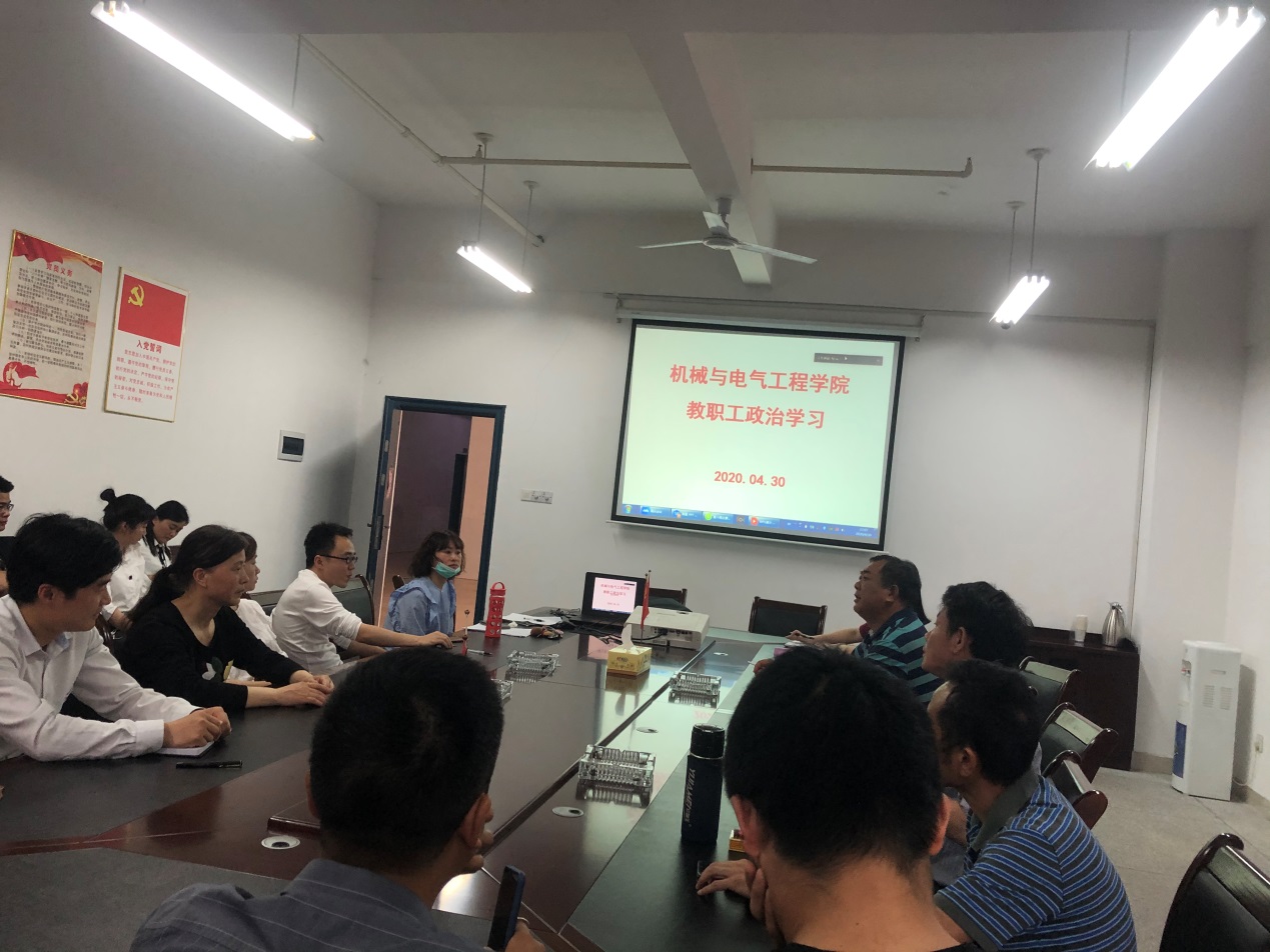 进一步贯彻传达米兰体育网页版四届五次教职工、工会会员代表大会成果和精神,2020年4月30日下午,机械与电气工程学院在会议室召开了全院教职工政治学习。由于疫情的影响,本次政治学习采取现场学习与线上会议相结合的形式举行,会议由党总支书记徐畅贤主持。