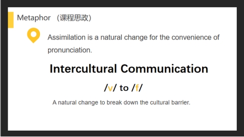 7.国际教育学院陈今晶老师结合同化的语音现象,让学生联想到跨文化交际。各个文化因存在差异,在交际过程中需要彼此适应,在交际中做出调整,号召学生提升国际视野、培养跨文化交际意识和能力。同时,号召学生走出舒适圈,比如在语音语调方面,改变一个词一个词读的旧习惯,养成连读的新习惯,又比如走出一种固定思维,进行创新,培养学生的创新创业意识和能力。