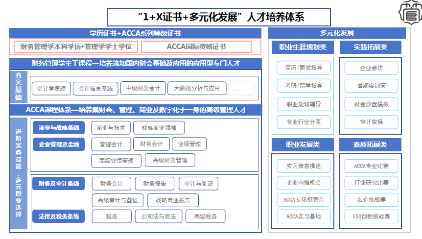 ACCA新文科卓越班人才培养采用“145+80学分”的模式,将英国特许公认会计师ACCA课程置入财务管理专业教学中,学员在本科阶段除完成财务管理专业145学分外,需学习单独设立的80学分的ACCA培训课程,获得相应学分数,并可选择参加特许公认会计师公会(Association of Chartered Certified Accountants,简称ACCA)的各科目证书考试。财务管理专业(ACCA)新文科卓越班单独设置了贯穿大学四年全程的丰富多元化发展的学习实践活动,形成了特色鲜明的“1+X证书+多元化发展”人才培养体系。