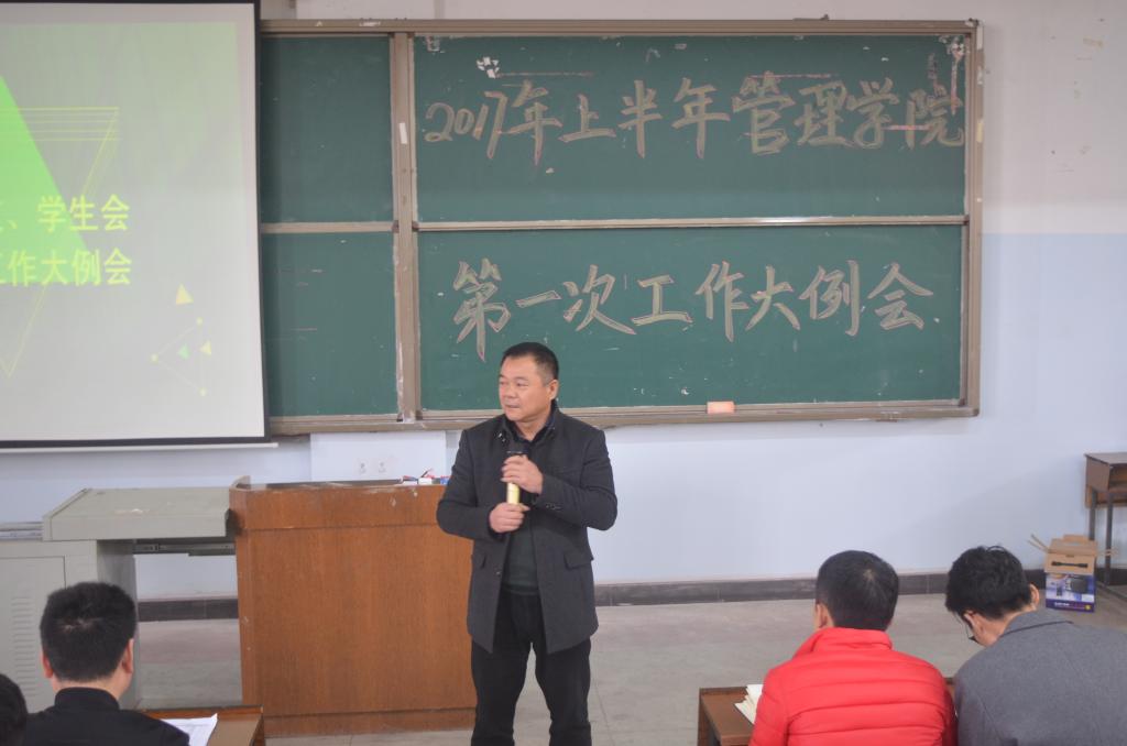 为了更好地推进学院工作开展,营造良好的精神风貌,管理学院于3月7日在一教207召开了本学期第一次工作大例会。出席会议的有:管理学院党委副书记贺望林、团总支书记熊鹏飞、辅导员王方俊、洪安健、李姗和彭志超,新任主席团成员。全体学生干部参加此次会议。