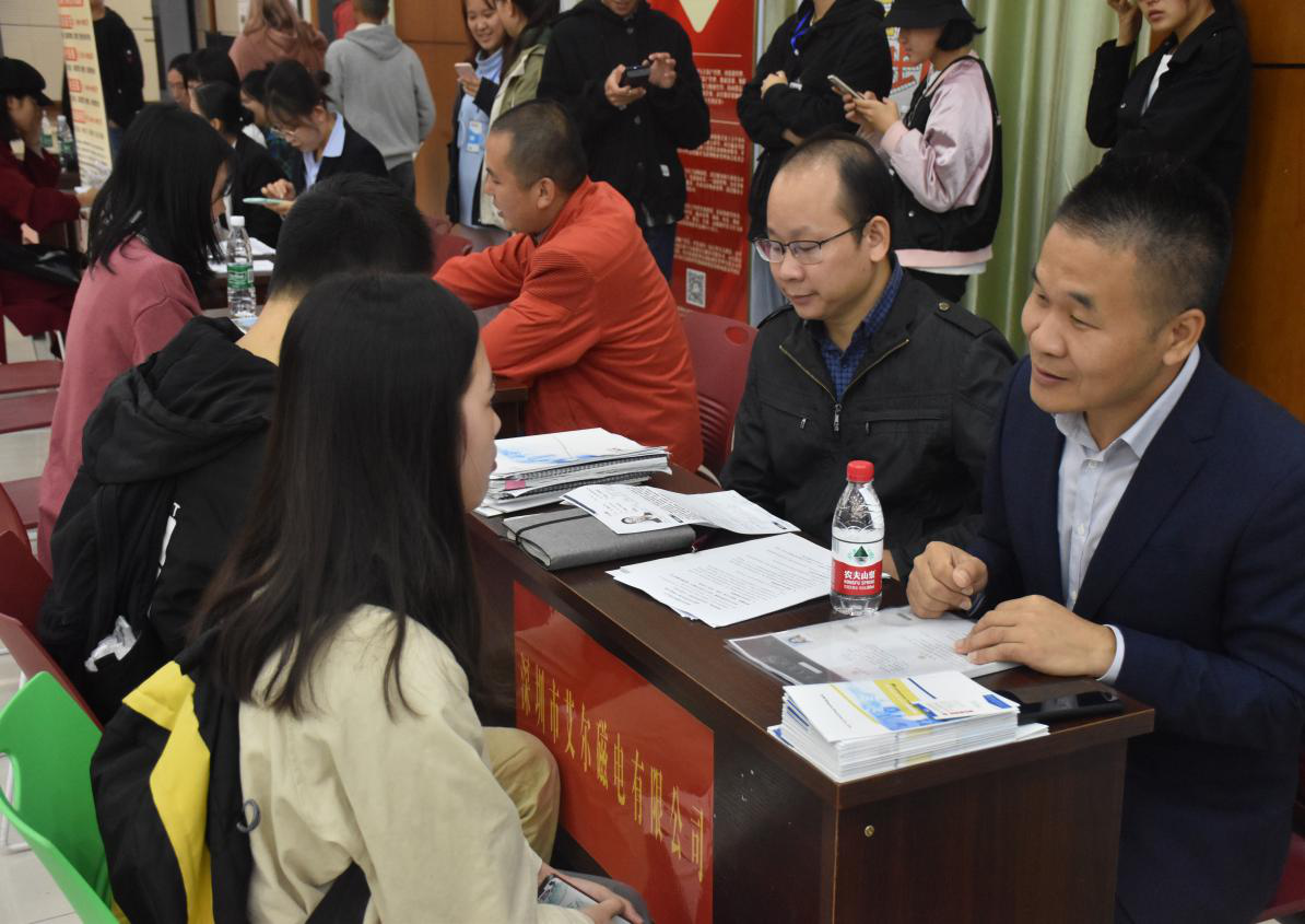 接着,到场同学与招聘单位进行沟通面试。招聘会现场气氛热烈,每一位面试的同学从容自信,侃侃而谈,展现了米兰体育网页版学子的良好修养。会中参会单位普遍认为我校人才培养质量较高,学生踏实肯干,适应能力强。招聘会期间,管理学院党委副书记王润华亲自与用人单位沟通交流,了解近期招聘要求及人才需求。并鼓励毕业生树立正确的就业观,做好长远职业规划,理性看待就业形势。据了解,广东省湖南益阳商会企业原计划招聘学生142人,广东省金康投资有限公司追加计划20人。