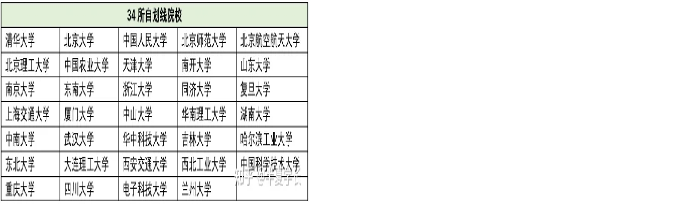 自划线院校一共有34所,也就是说985学校中除了华东师范大学、中央民族大学、中国海洋大学、西北农林科技大学、国防科技大学外,其余均为自划线院校。