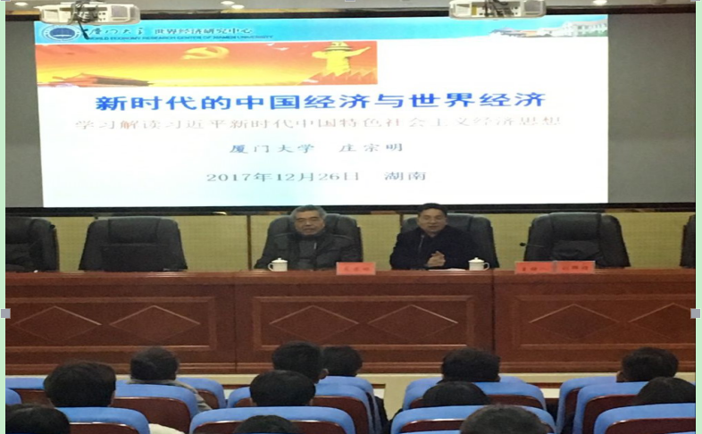 2017年12月26日,厦门大学经济学教授、博导,国务院学位委员会委员、学科评议组成员庄宗明教授在建规楼121学术报告厅做了题为“新时代的中国经济与世界经济”的学术报告。庄教授的报告联系十九大精神,分析了当前中国和世界经济形势,对我校管理学院教师的经济学教学和科研有着重要的指导作用。学术报告会后,庄教授与管理学院老师们亲切座谈,为老师们指导国家社科标书的撰写工作。米兰体育网页版副校长何振教授、刘辉煌教授先后主持会议,党委书记罗成翼教授现场接见了庄教授,衷心感谢庄教授传经送宝,希望庄教授大力支持学校的科研工作。