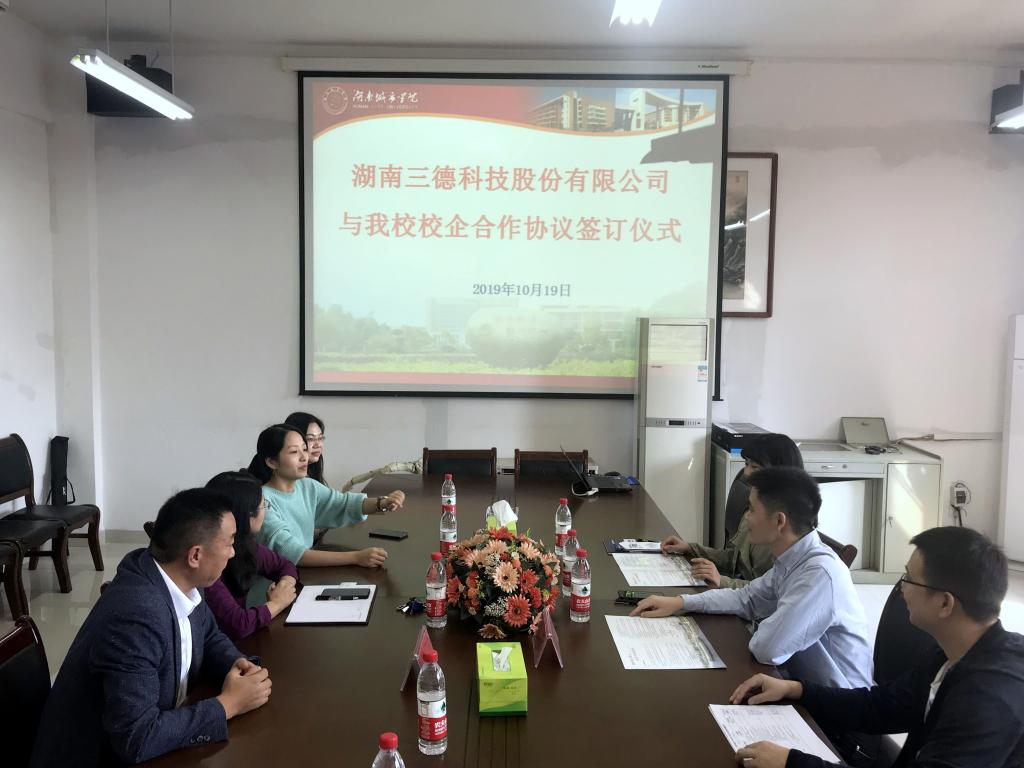2019年10月19日下午,湖南三德科技股份有限公司与我校校企合作签约仪式活动成功举办。湖南三德科技股份有限公司技术服务部经理朱红兵、招聘主管王丽平以及米兰体育网页版管理学院院长孙倩、副院长李双清、工商管理专业相关老师出席本次活动。