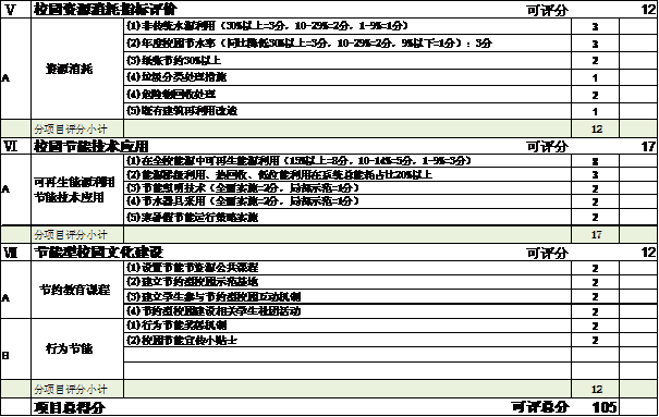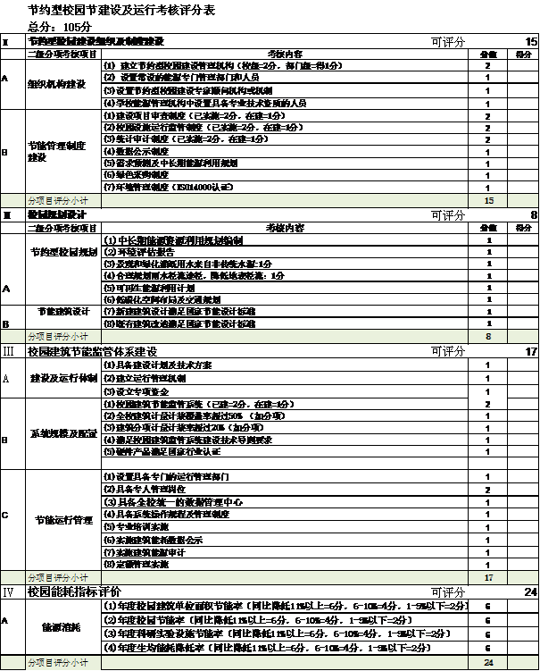 第十一条本办法规定了节约型校园建设考核评价评分表,将评分表按以下分项规定了各分项分值。考核分值的设定原则为:以节约型校园建设各个环节的实施程度为评价基础,以校园建筑节能监管体系建设为重点评价内容,定性与定量评价相结合,设定总分值为105分。