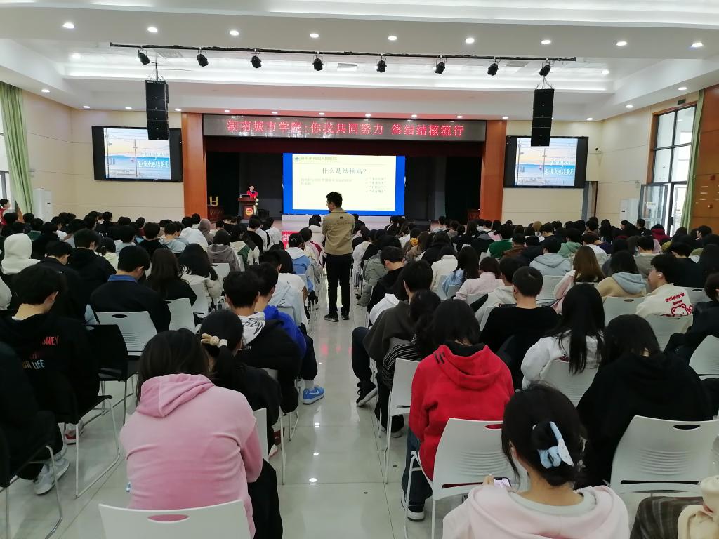 3月21日下午,益阳市疾病预防控制中心、赫山区疾病预防控制中心、益阳市第四人民医院在我校学生活动中心联合开展健康宣教讲座,300多名师生聆听。讲座内容包括结核病、肝炎和艾滋病的防治以及院前急救等四个方面。益阳市疾病预防控制中心结核病防治科负责人表示,终结结核流行,需要你我共同努力,需要全校师生员工的共同参与。并就我校做好今年结核病防治工作提出三点指导性建议,一要加强结核病防治知识的宣传教育;二要持续做好结核病的筛查和监测工作;三要加强部门合作和社会参与。同时,鼓励大学生志愿者不懈努力,号召更多的师生参与到结核病防治事业中来,营造全校共同防治结核病的良好氛围。