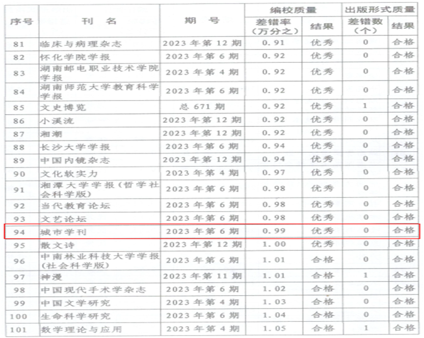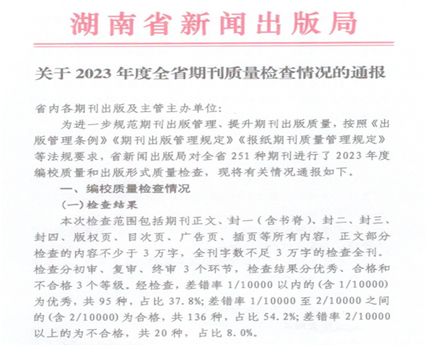 近日,湖南省新闻出版局下发《关于2023年度全省期刊质量检查情况的通报》,《米兰体育网页版学报(自然科学版)》和《城市学刊》获评“优秀”等级。