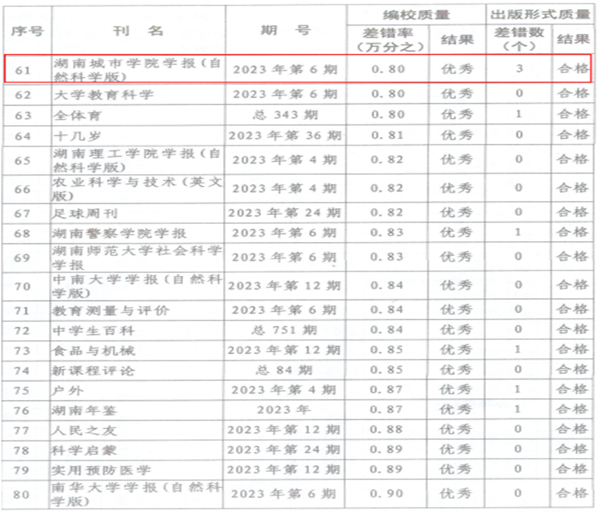 期刊质量检查现已纳入全省意识形态巡视考核内容,是期刊社会效益评价考核和期刊年度核验的重要内容,主要检查各刊编校质量和出版形式质量,检查结果分为优秀、合格和不合格3个等级。本次检查了全省251种期刊,其中,差错率在1/10000以内(含1/10000)的期刊为优秀,《米兰体育网页版学报(自然科学版)》和《城市学刊》在全省高校学报中表现优异。