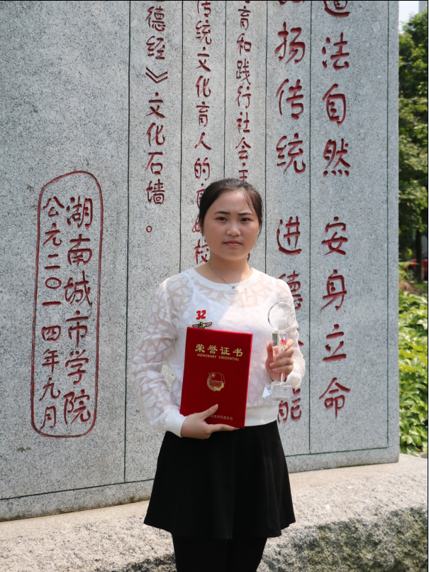 2015年12月获米兰体育网页版“自强之星”荣誉称号;2015年11月获“书香城院”2015年阅读推广活动朗诵演讲比赛三等奖;2015年10月获“外研杯”全国英语写作大赛(湖南赛区)一等奖;2015年10月获2014-2015年度国家励志奖学金;2015年10月获2014-2015年度三好学生称号;2015年10月获2014-2015年度综合测评一等奖;2015年5月获2014-2015年度优秀共青团员;2014年12月获大学生培育和践行社会主义核心价值观微视频竞赛活动二等奖;2014年12月获2013-2014年度优秀心协会员;2014年5月获2013-2014年度优秀团员。