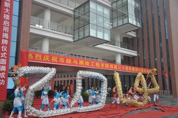 11月 29日 上午,我校市政与测绘工程学院办学三十周年塈新大楼启用揭牌仪式在新市政与测绘大楼西门隆重举行,校长李建奇,党委副书记、副校长龚卫明,人事处、宣传部、教务处领导和校友代表、桃江自来水公司等特邀单位代表、学院师生等参加活动。活动由市测院党总支书记杨文彬主持。