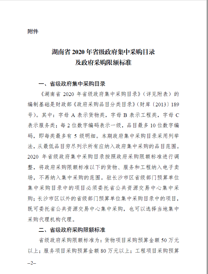 湖南省 2020 年省级政府集中采购目录及政府采购限额标准